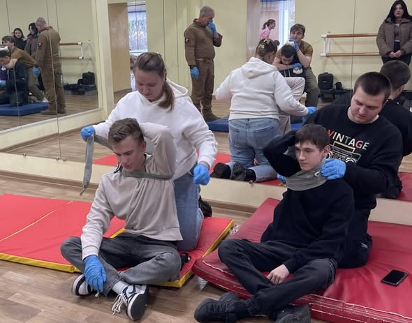 Семінар для студентів ХІСТ спеціальності «терапія та реабілітація» з техніки надання допомоги при різних надзвичайних станах загрозливих життю: кровотечі, переломи, поранення за допомогою повʼязок, турнікета, засобів іммобілізації і т.п.